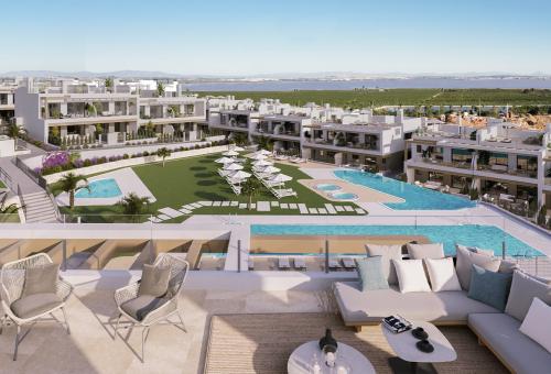 Coronella Living by TM liegt in ruhiger Lage am Stadtrand von Torrevieja, mit Blick über die Laguna Rosa und das Meer, nur 5 km vom Sandstrand und der Promenade entfernt – mit bester Anbindung an Einkauf, Gastronomie und renommierte Golfplätze der Region.