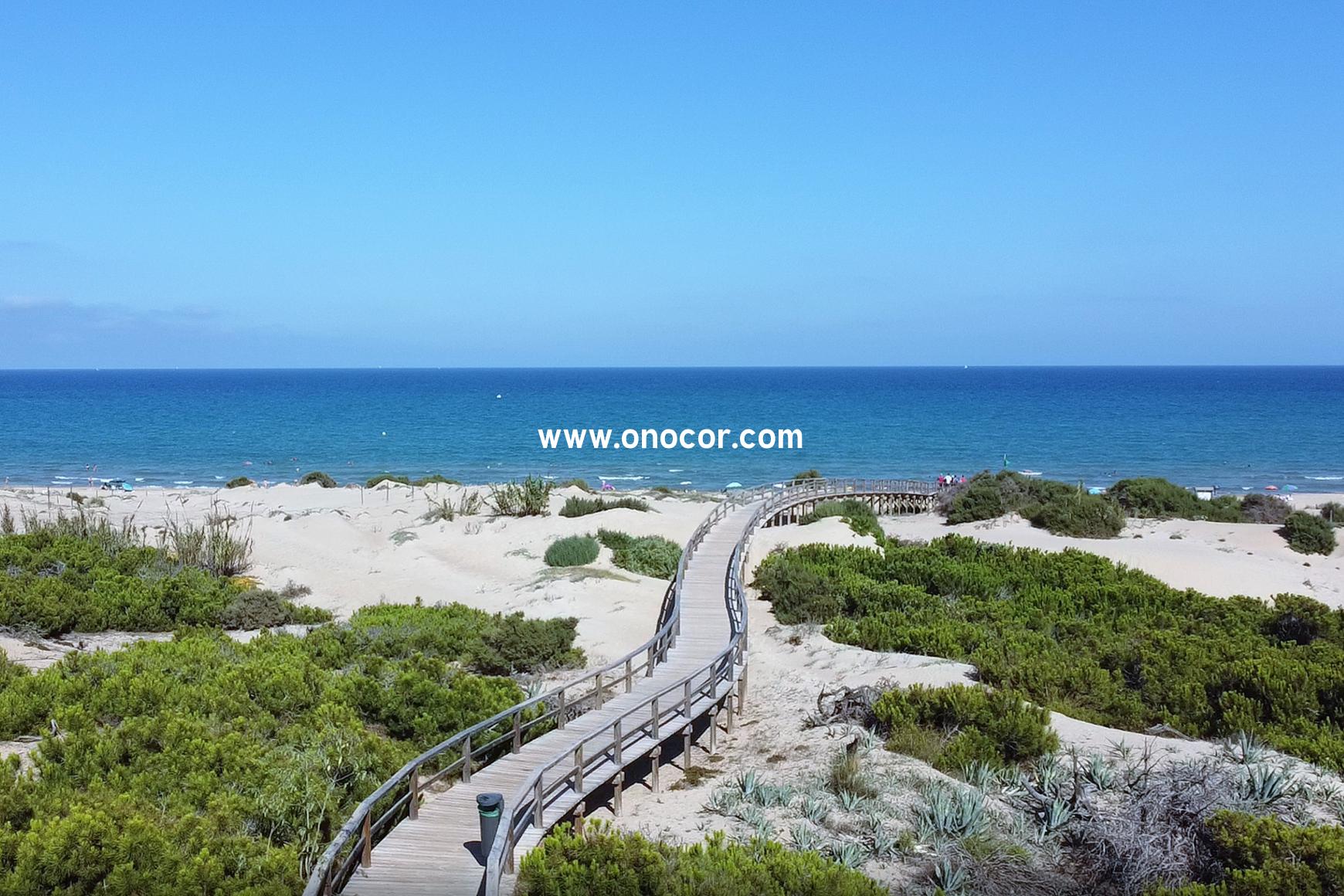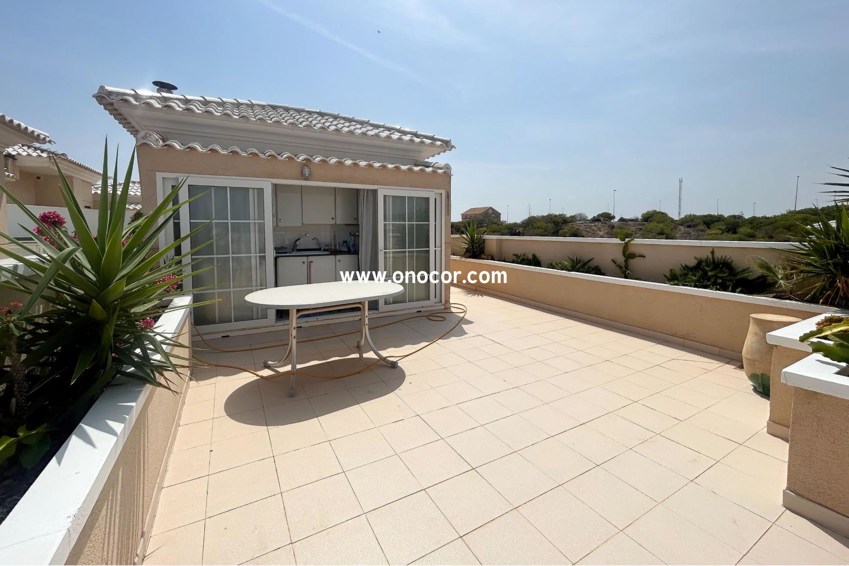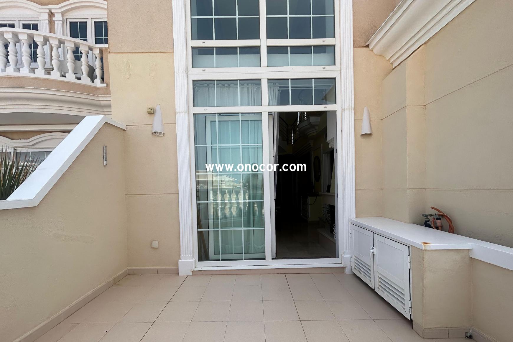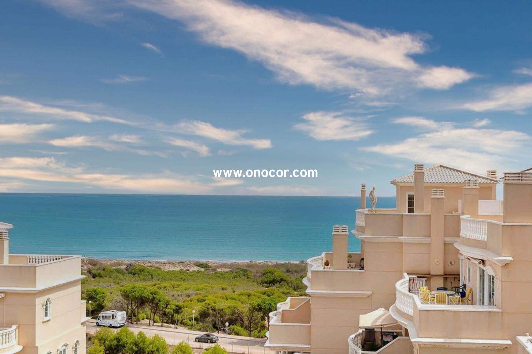 Zum Verkauf steht ein exklusives Duplex-Penthouse im Wohnkomplex „Portico Mar“, direkt an einem geschützten Pinienwald und nur 200 m vom feinsandigen Dünenstrand entfernt. Die Wohnung mit ca. 90 m² Wohnfläche erstreckt sich über zwei Ebenen und bietet ein helles Wohnzimmer mit Meerblick und Zugang zur Terrasse, eine separate, voll ausgestattete Küche, Essbereich sowie zwei Schlafzimmer mit jeweils eigenem Bad. Im Obergeschoss befindet sich eine Galerie, ideal als Büro oder Bibliothek, sowie der Zugang zur privaten Dachterrasse mit Außenküche und viel Platz für Lounge, Whirlpool oder Fitness – alles mit atemberaubendem Blick auf Meer, Pool und Natur. Die Immobilie ist elegant eingerichtet und verfügt über Klimaanlage warm/kalt, große Fensterfronten, eine Tiefgarage und einen Abstellraum. Der Wohnkomplex bietet tropische Gärten, drei Pools mit Wasserfällen, 24-Stunden-Sicherheitsdienst, Concierge sowie Restaurants und Bars. Einkaufsmöglichkeiten, Guardamar del Segura und Torrevieja sind schnell erreichbar. Kaufpreis: 389.000 €.