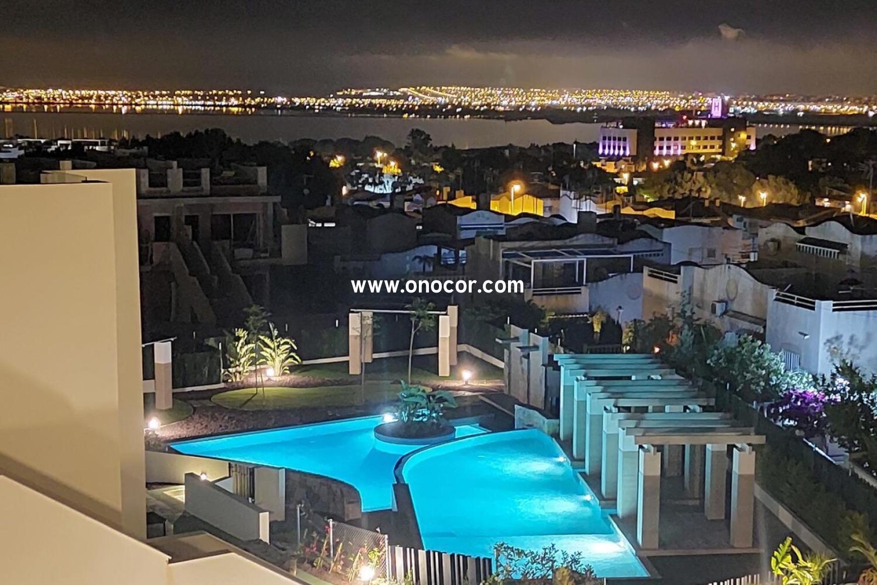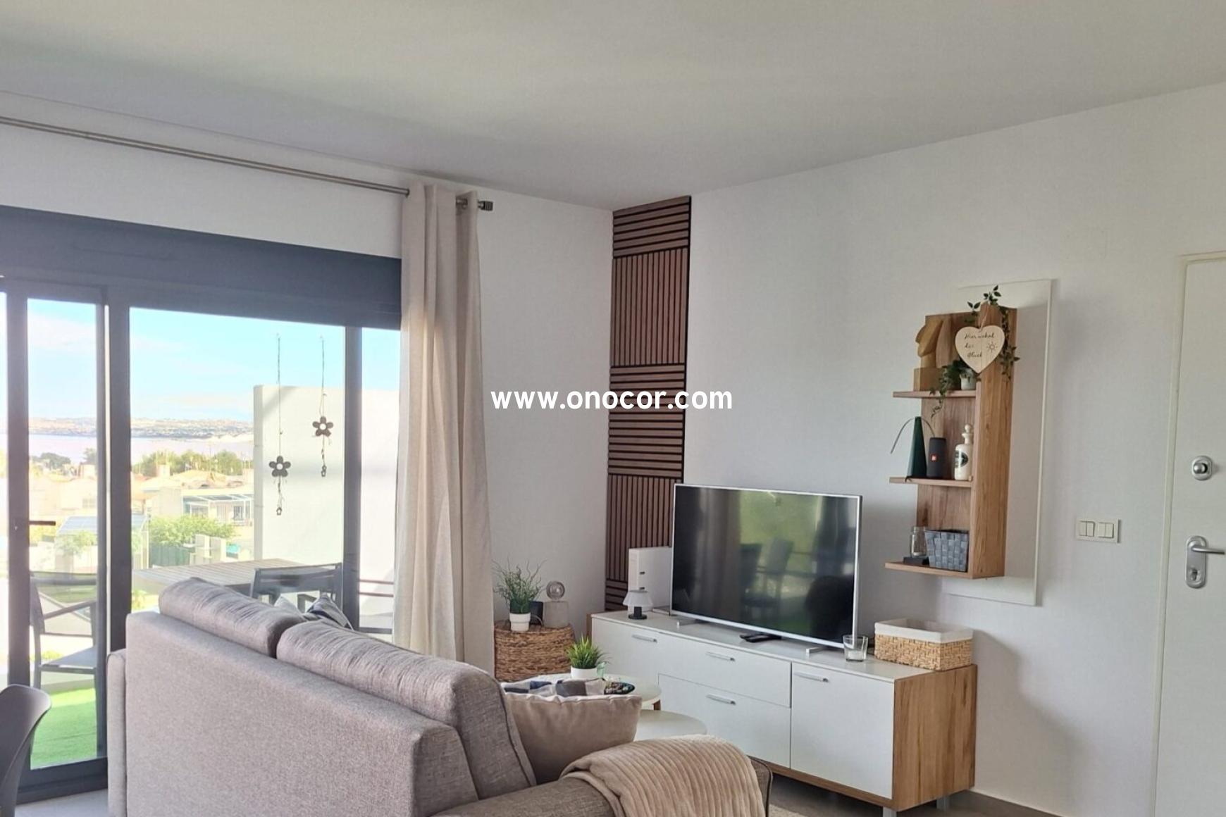 Vom Apartment und der großen privaten Dachterrasse hat man einen atemberaubenden Blick über die Poollandschaft, die umliegenden Berge und den Salzsee. Die Wohnanlage verbindet auf elegante Weise mediterranen Charme mit moderner Architektur. Supermärkte, Bars und Restaurants sind bequem zu Fuß erreichbar. Drei Gemeinschaftspools, gepflegte Grünanlagen, eine gesicherte Einfahrt und private Parkmöglichkeiten runden das Angebot ab. Das Apartment wird teilmöbliert verkauft.