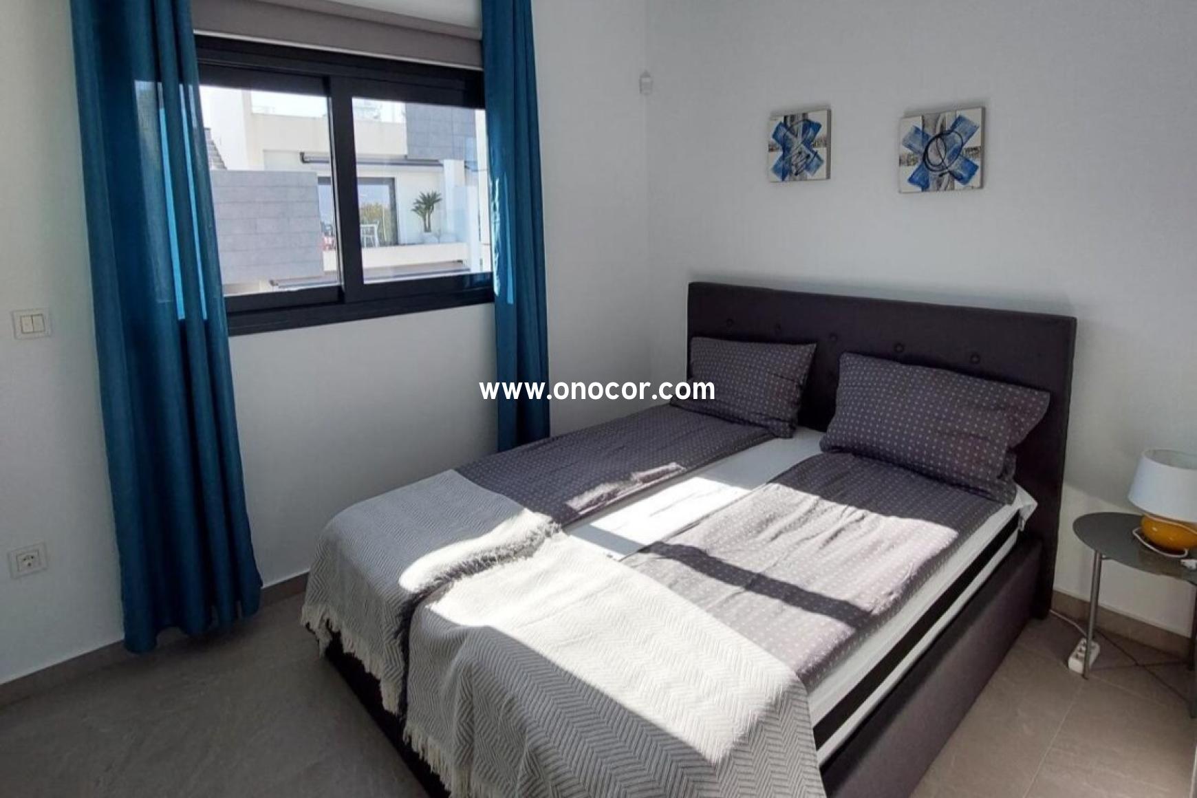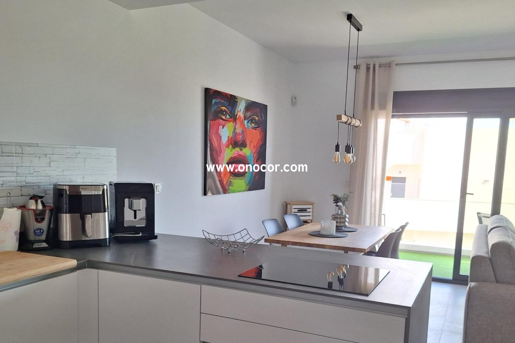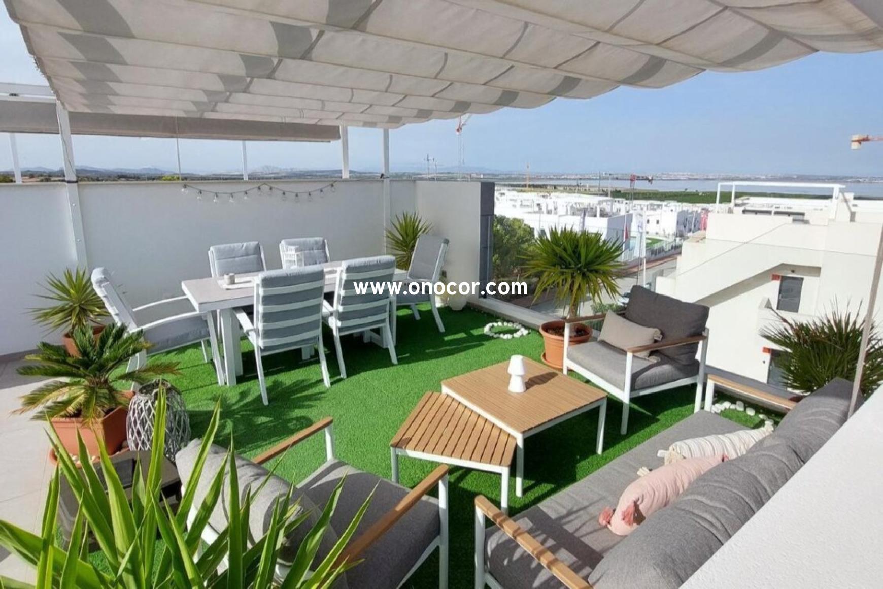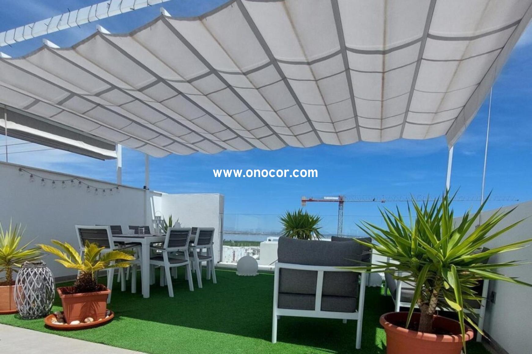 Dieses moderne Penthouse-Apartment aus dem Jahr 2022 in Los Balcones befindet sich in einer geschlossenen Wohnanlage, die leicht erhöht liegt. Auf 78 m² Wohnfläche bietet es 2 Schlafzimmer, 2 Badezimmer, eine offene Küche sowie einen 8 m² Balkon.