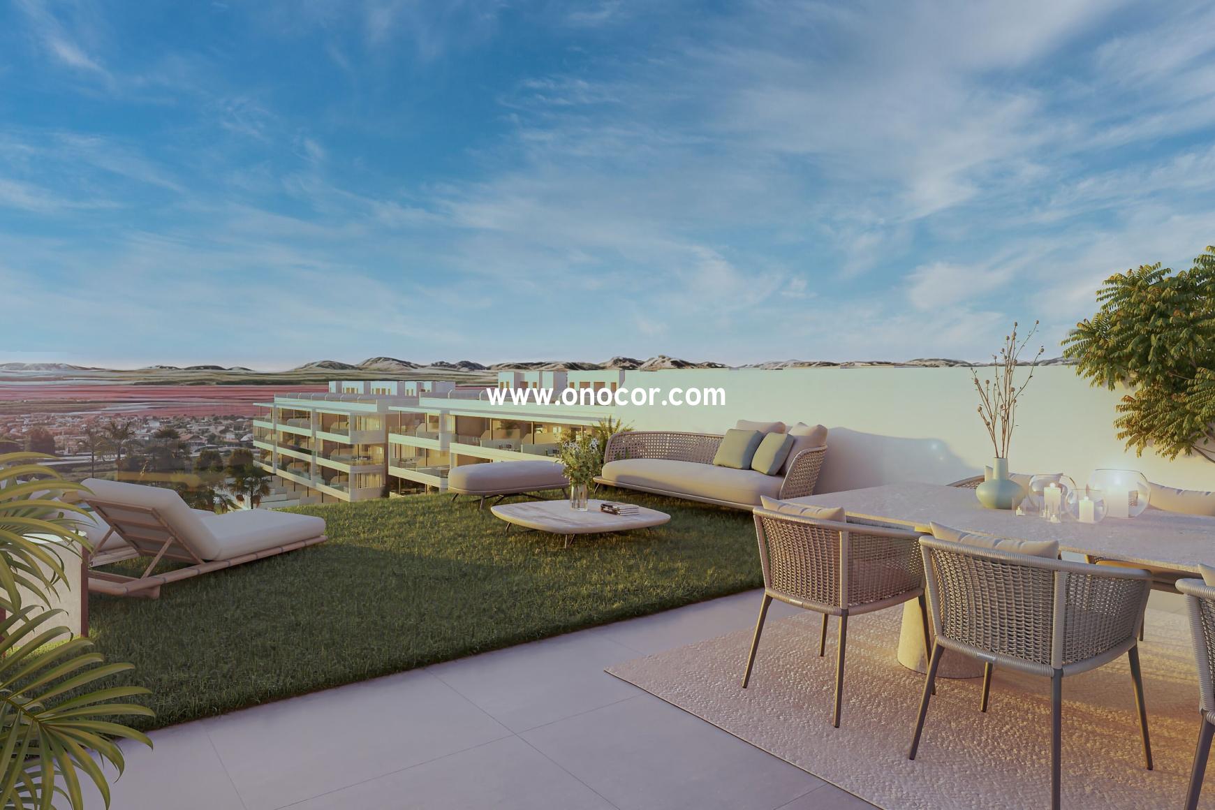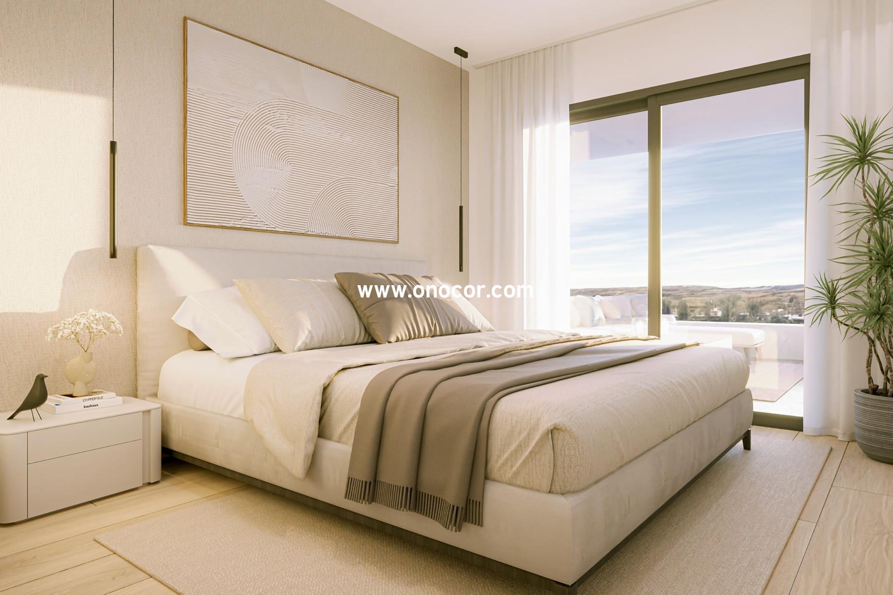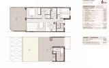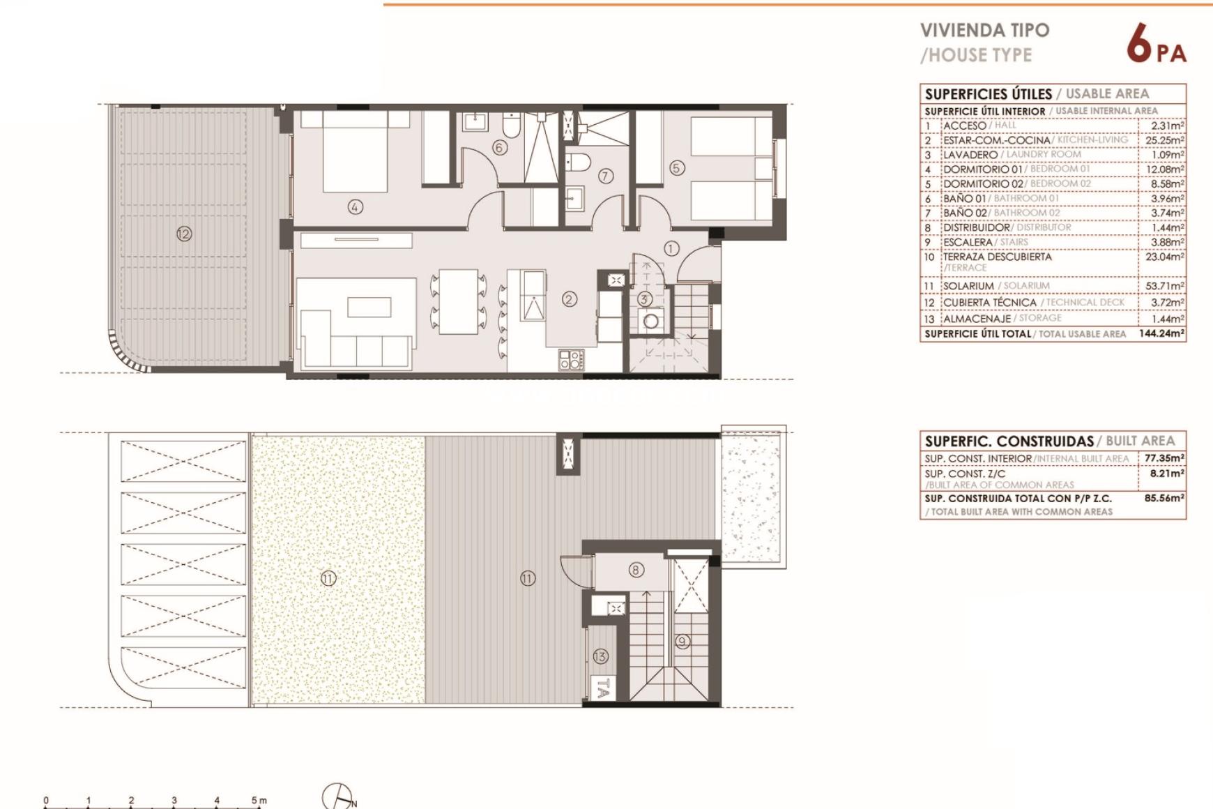 Das Penthouse hat eine Gesamtfläche von 78 m² und verfügt über zwei Schlafzimmer und zwei Badezimmer, eines davon en suite. Ein besonderes Highlight ist der überdachte Balkon mit 23 m² sowie die private Dachterrasse von 53 m², die über eine Innentreppe zugänglich ist und großzügigen Platz für Sonnenbaden oder Outdoor-Living bietet. Helle Räume, moderne Architektur und hochwertige Bauausführung schaffen ein komfortables Wohnambiente.