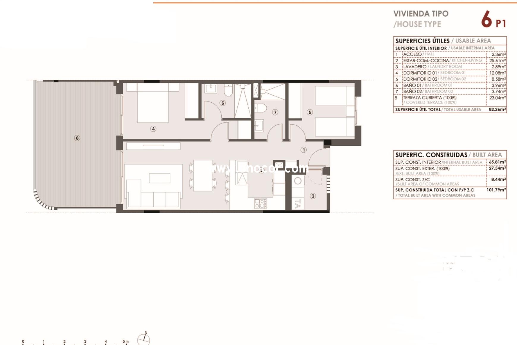 Die Wohnung verfügt über eine Gesamtfläche von 82 m² und bietet einen funktionalen Grundriss mit zwei Schlafzimmern und zwei Badezimmern, eines davon en suite. Der großzügige, überdachte Balkon mit 23 m² erweitert den Wohnraum nach außen und bietet angenehmen Platz zum Entspannen